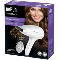 Braun Satin Hair 3 PowerPerfection dryer HD385 with Ionic function and styling nozzle.