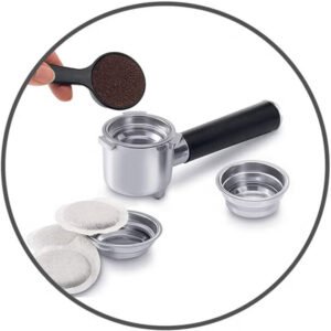 The professional filter holder, with an integrated crema device, is suitable for ground coffee (1 and 2 cups) and E.S.E. pods.
