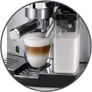 De’Longhi patented Automatic Cappuccino System, to obtain delicious “cappuccino” and “latte macchiato”. Automatic rinsing system. After use, the milk carafe can be placed directly into the fridge.
