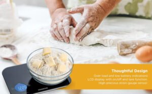 Introducing the Kenwood Digital Kitchen Scale – the perfect solution for getting the right portion size and ensuring perfect nutrition for your family. This scale is easy to use and features a space-saving design, making it a great addition to any kitchen. You’ll never have to worry about overloading the scale or running out of battery, as it comes equipped with overload and low battery indications. The LCD display with on/off and tare function provides accurate readings every time, thanks to the high-precision strain gauge sensor. The surface is made of high-tempered glass, making it easy to clean and maintain. Get yours today and start enjoying perfectly portioned meals!